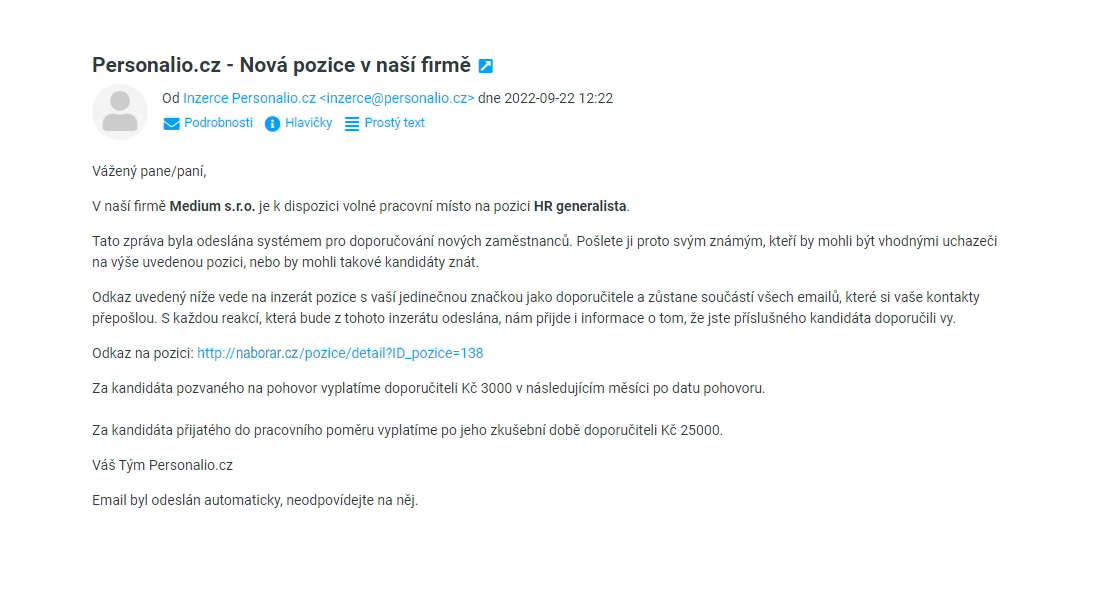 Všichni adresáti, včetně všech přeposlaných, dostanou email s kódovaným odkazem na inzerát pozice. Ten slouží k identifikaci doporučitele, jímž je první adresát z distribučního seznamu, jako doporučující zdroj reagujícího kandidáta.