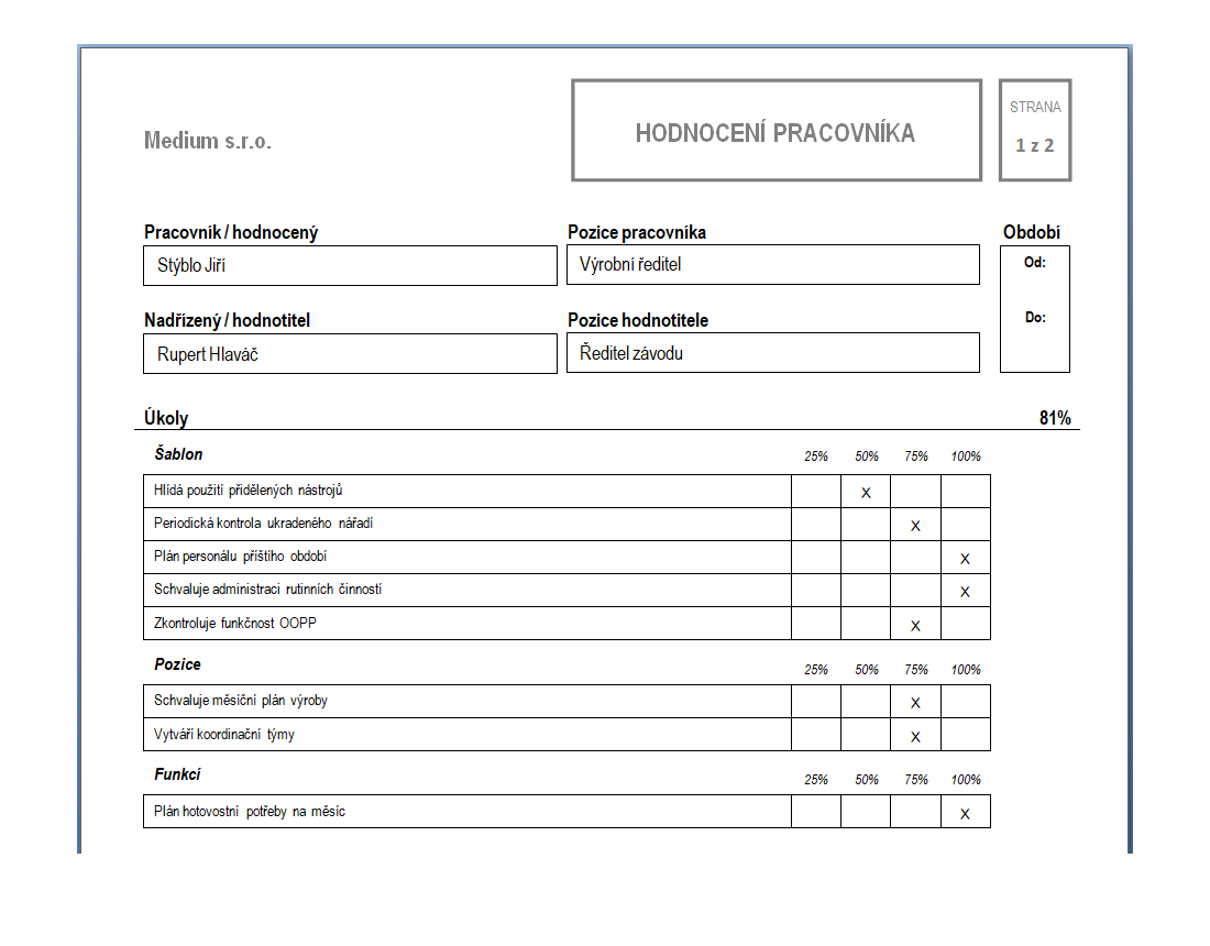 Hodnocení pracovního výkonu se měří čtyřstupňovou škálou, a to v oddílech Úkoly, Kvalifikace a Způsobilosti. Hodnocení úkolů provádí hodnotitel, zpravidla nadřízený, zaškrtnutím příslušné úrovně plnění. Přitom má k dispozici nápovědu ukazatele výkonu.