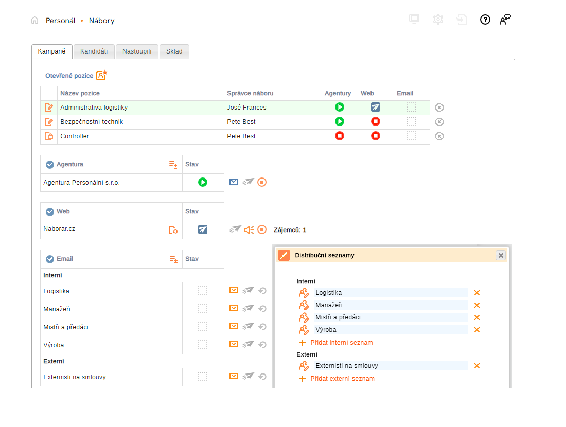 Emaily rozesílané dle distribučních seznamů jsou stěžejní komponentou systému pro doporučení zaměstnanců. Změní-li se obsah inzerátu, podmínky náboru apod., je možné emailový kanál resetovat a rozeslat emaily znovu s novým obsahem.