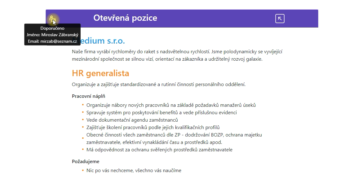 Všichni adresáti, včetně všech přeposlaných, dostanou email s kódovaným odkazem na inzerát pozice. Ten slouží k identifikaci doporučitele, jímž je první adresát z distribučního seznamu, jako doporučující zdroj reagujícího kandidáta.