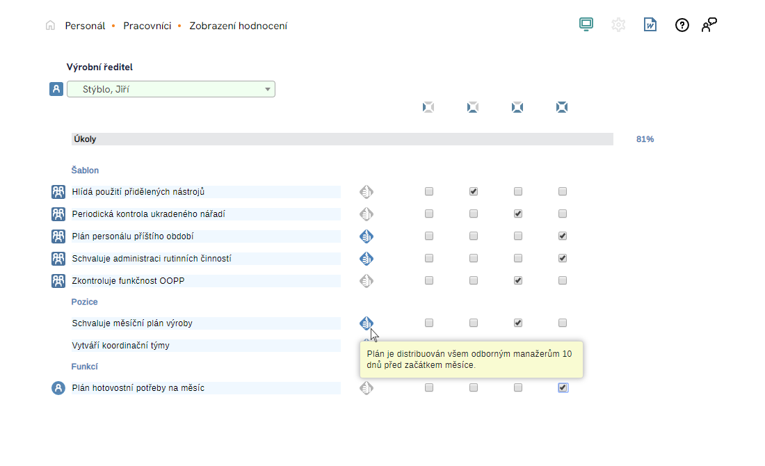 Hodnocení pracovního výkonu se měří čtyřstupňovou škálou, a to v oddílech Úkoly, Kvalifikace a Způsobilosti. Hodnocení úkolů provádí hodnotitel, zpravidla nadřízený, zaškrtnutím příslušné úrovně plnění. Přitom má k dispozici nápovědu ukazatele výkonu.
