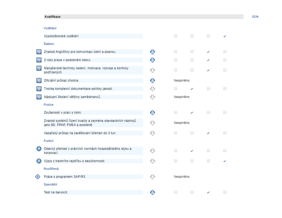 Plnění kvalifikačních požadavků je zobrazováno přímo z dat osobního kvalifikačního profilu vedených pro konkrétního pracovníka v sekci Školení. Z hodnot v oddílech Úkoly, Kvalifikace, Způsobilosti se počítá procentuální plnění zvlášť pro každý z nich.