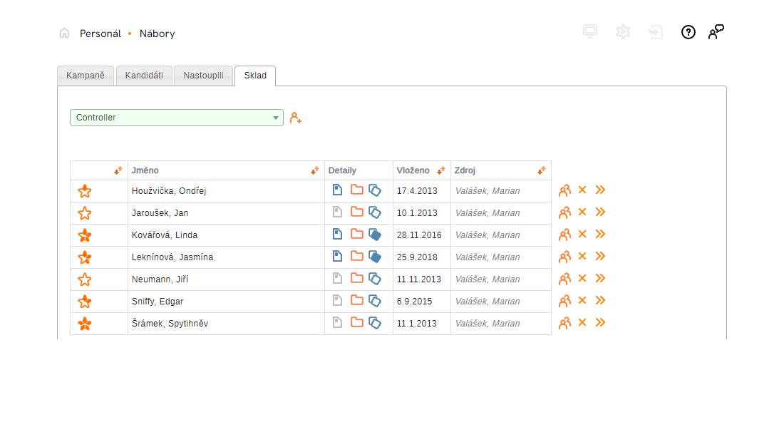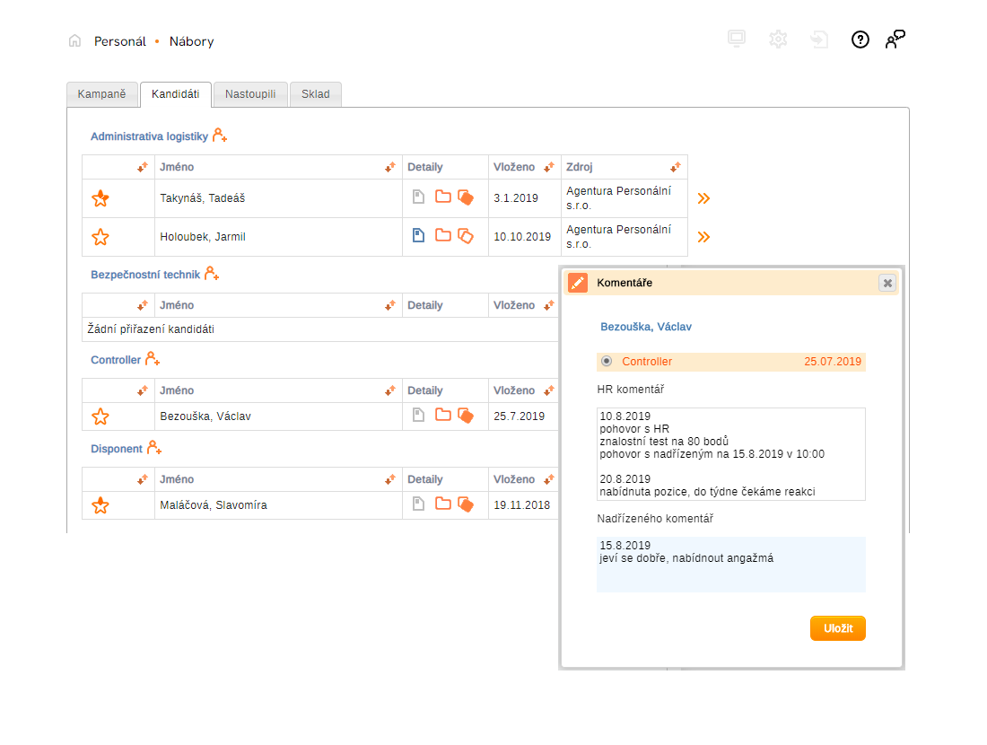 U kandidátů otevřených pozic se mimo jiné zobrazuje zdroj, a to agentura, web, doporučující zaměstnanec nebo ruční vložení. Data náboru sdílejí personalista a nadřízený pozice, pro jejich společné poznámky slouží okno Komentáře.