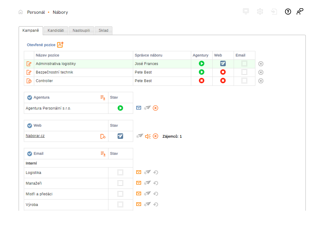 Pozici se založeným inzerátem lze otevřít pro náborovou kampaň. Poté se inzerát pozice odešle agenturám, na web Náborář.cz nebo na emaily dle distribučních seznamů. Funkční ikony vždy znázorňují aktuální stav kampaně a dostupné operace s inzercí.
