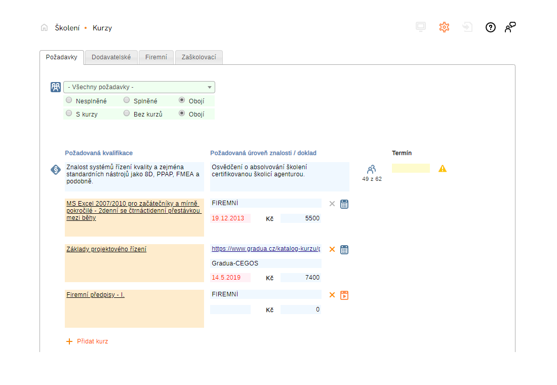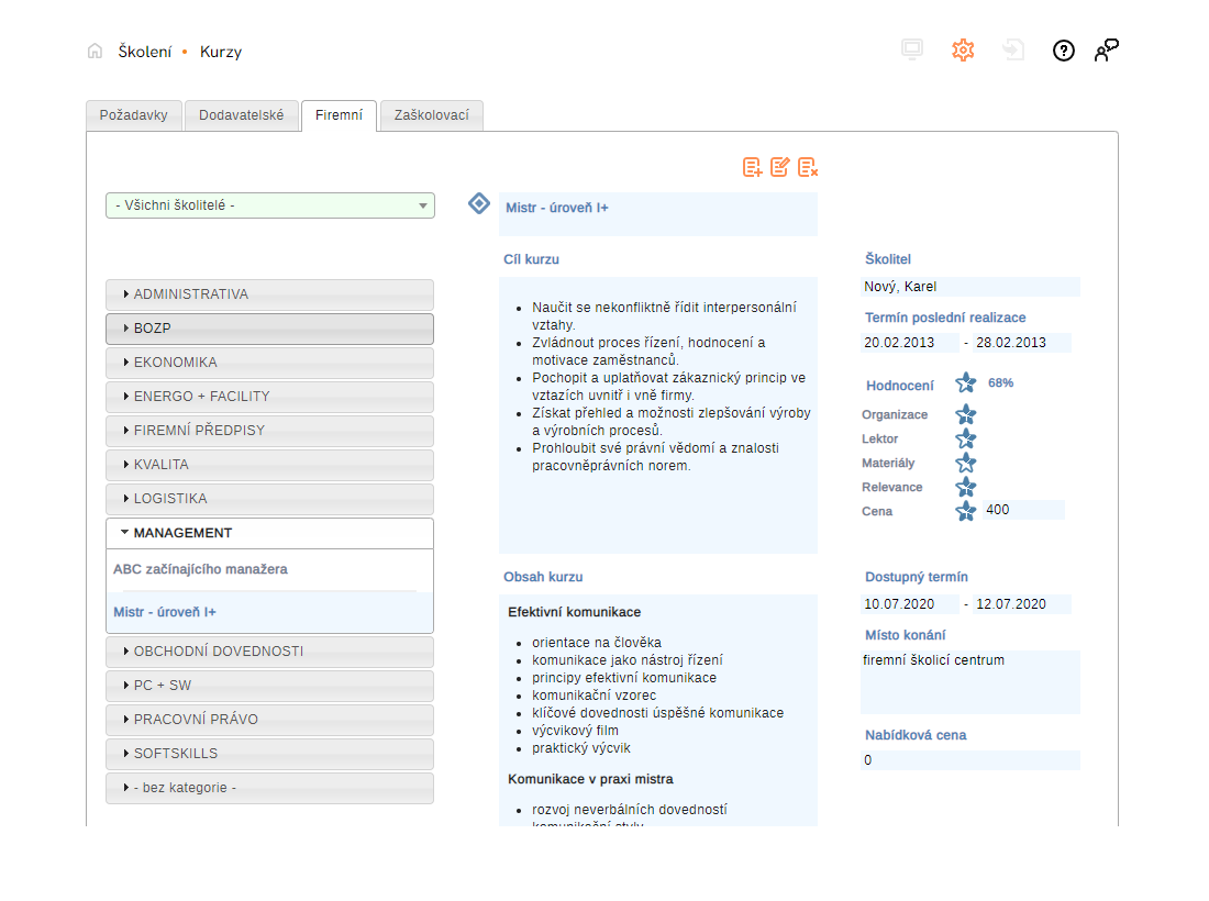 Kurzy jsou děleny na dodavatelské nebo firemní, lze je sdružovat do kategorií a editovat všechny podstatné údaje včetně jejich hodnocení. Dodavatelský kurz přidaný ke kvalifikaci z internetu se automaticky zaeviduje i do vaší uživatelské databáze.