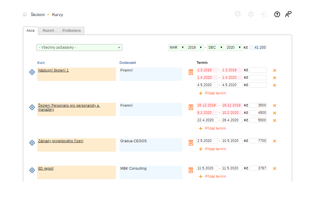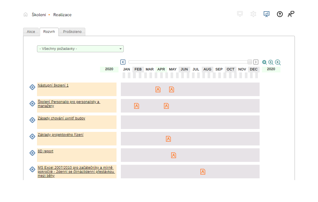 Pracovníci jsou na základě svých kvalifikačních profilů a záznamů o proškolení zařazeni do plánu školení automaticky. Vybrané kurzy k realizaci jsou zobrazeny na záložce Akce, kde se zadávají data jejich konání a potvrzují účastníci u konkrétních termínů.