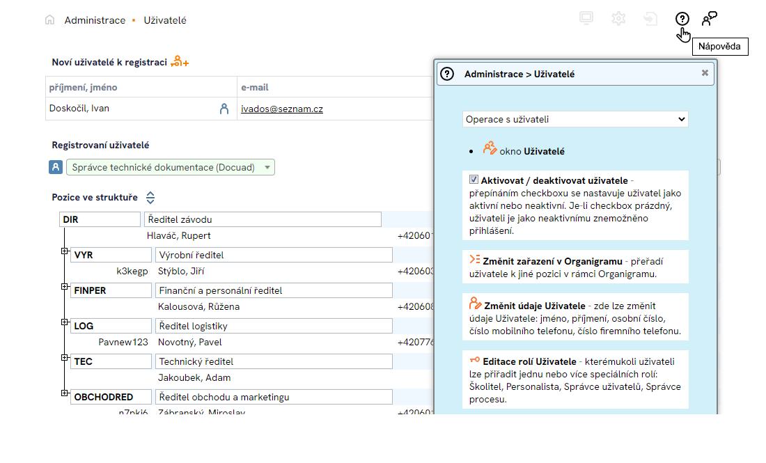 Pro všechny operace a postupy je v každé sekci k dispozici integrovaná tématická nápověda pokrývající všechny funkčnosti aplikace. Má tak charakter manuálu, který na každé stránce poskytuje kompletní informace pro práci s programem.