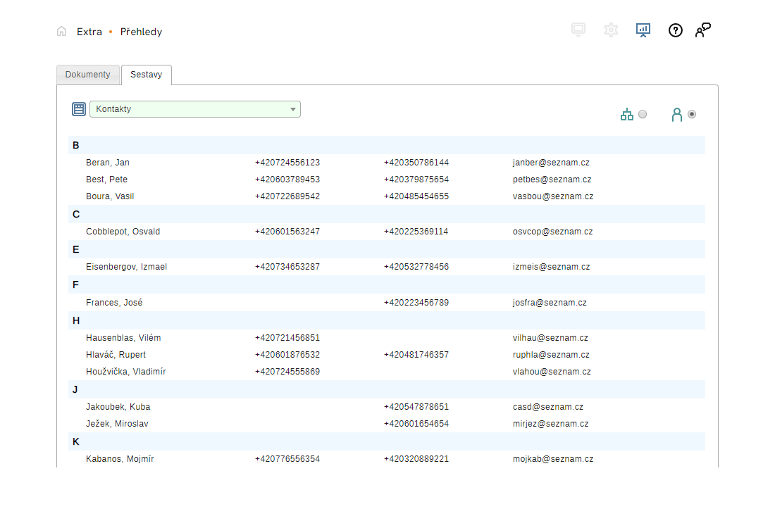 Přístup do této sekce mají všichni registrovaní uživatelé bez ohledu na jejich role. Na záložce Dokumenty jsou dostupné veřejné dokumenty vytvořené v sekci Komunikace. Sestavy představují fixně definované výstupy z dat v aplikaci.